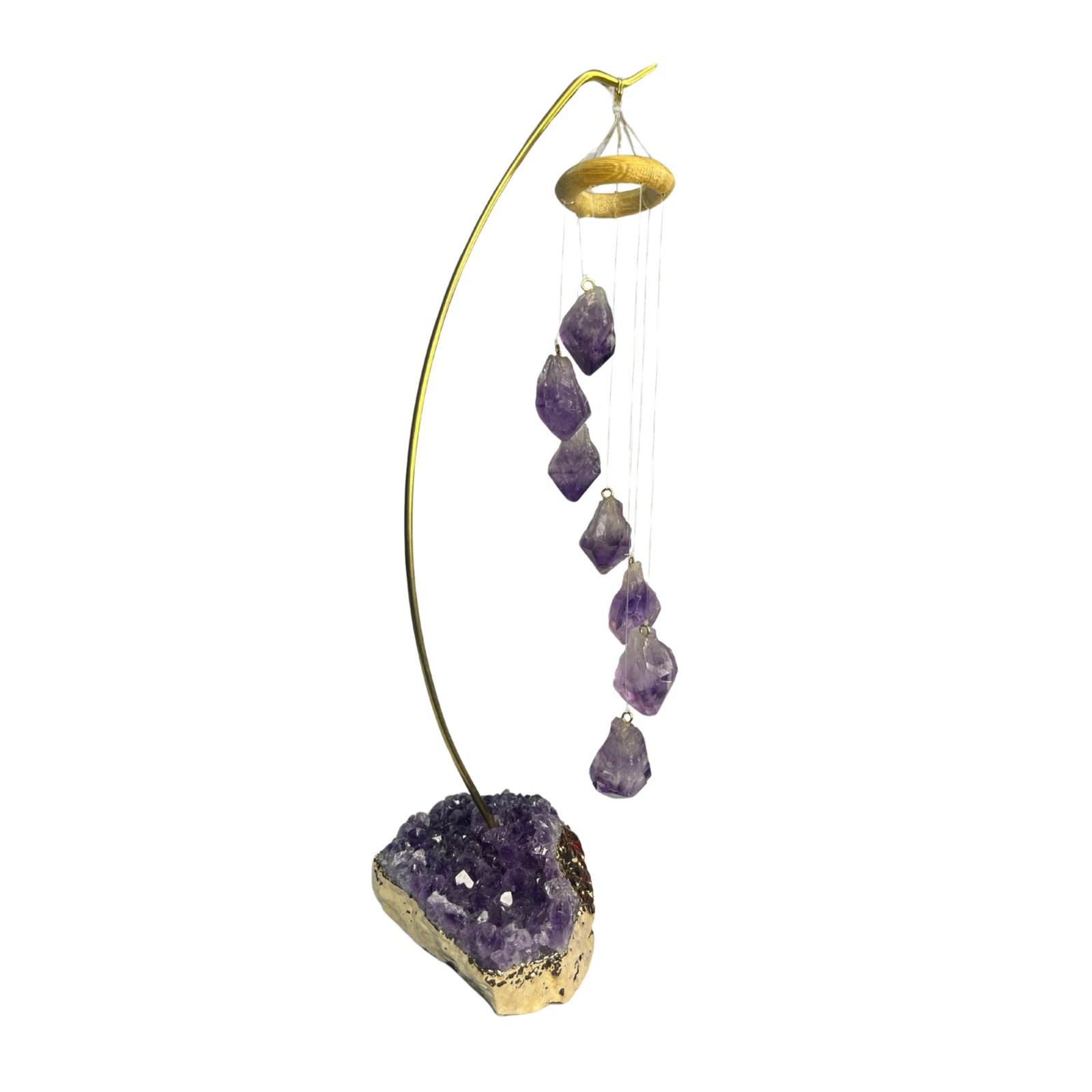 Sino de pedra 7 peças de ametista com base de druza de ametista banhado a ouro com tom roxo profundo, a Ametista é símbolo de proteção, espiritualidade e equilíbrio. Um clássico atemporal que traz beleza e serenidade a qualquer espaço.